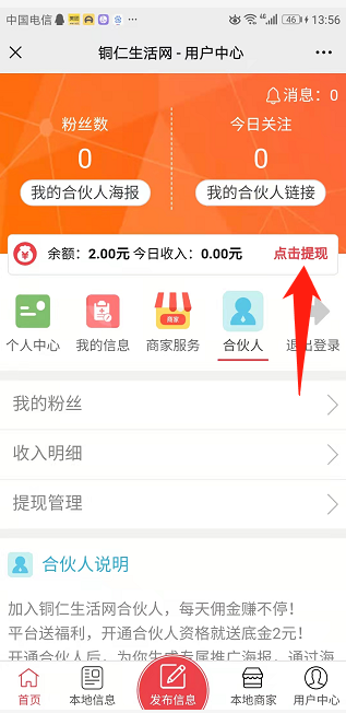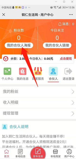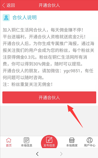 如何開(kāi)通合伙人直接登錄你的賬號(hào),沒(méi)有賬號(hào)也可以直接使用微信登錄點(diǎn)擊合伙人點(diǎn)擊開(kāi)通合伙人開(kāi)通后直接送2元底金如何賺傭金點(diǎn)擊我的合伙人海報(bào),把海報(bào)保存到手機(jī),分享到朋友圈或好友好友掃碼(長(zhǎng)按識(shí)別二維碼)關(guān)